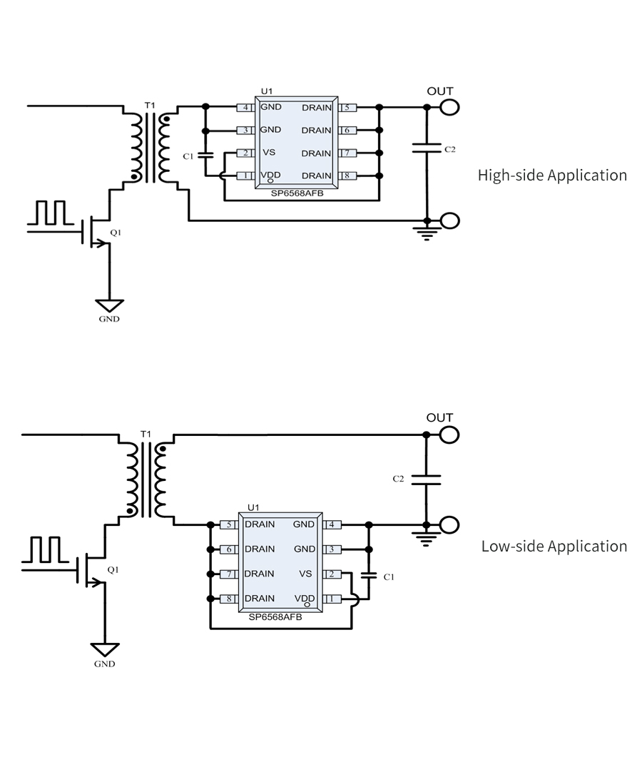 SP6568AFB是一顆高性能的開(kāi)關(guān)電源次級(jí)側(cè)同步整流控制電路。在低壓大電流開(kāi)關(guān)電源應(yīng)用中,輕松滿足6級(jí)能效,是理想的超低導(dǎo)通壓降整流器件的解決方案。芯片可支持高達(dá)150KHz的開(kāi)關(guān)頻率應(yīng)用,并且支持CCM / QR / DCM等開(kāi)關(guān)電源工作模式應(yīng)用,其極低導(dǎo)通壓降產(chǎn)生的損耗遠(yuǎn)小于肖特基二極管的導(dǎo)通損耗,極大提高了系統(tǒng)的轉(zhuǎn)換效率,大幅降低了整流器件的溫度。