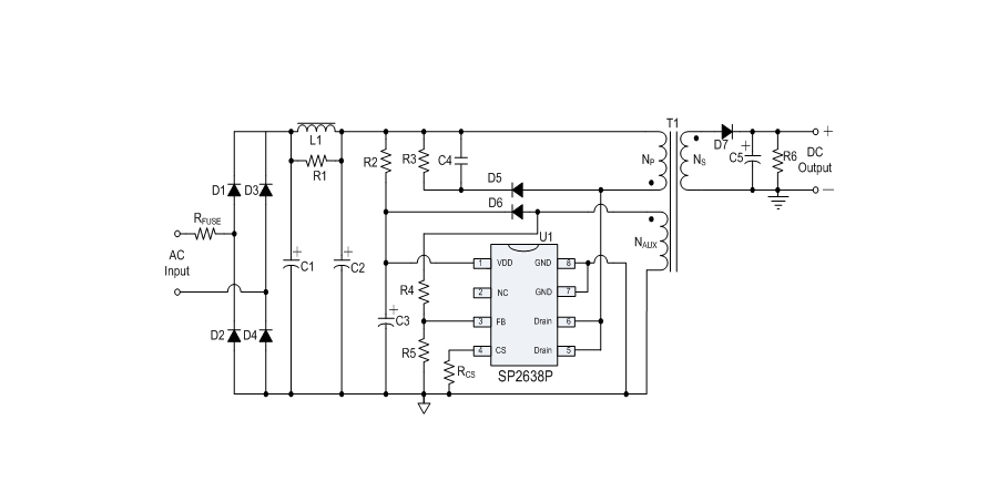 SP2638P是一款性能優(yōu)異的原邊反饋控制電路,應用于小功率AC/DC充電器與適配器。控制電路使用原邊采樣技術(shù)進行精確的恒流、恒壓控制,可以省去一般應用中的光耦與TL431。
